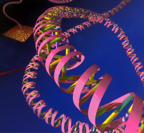 1953年4月25日,世界權(quán)威雜志《自然》雜志發(fā)表了沃森、克里克的一篇900多字優(yōu)美精煉的短文,宣告了DNA分子雙螺旋結(jié)構(gòu)模型的誕生。這個結(jié)構(gòu)模型的要義是:DNA是一個長長的雙鏈分子,由兩條同軸反向相互纏繞的多核苷酸鏈組成,外側(cè)是由脫氧核糖和磷酸根組成的分子骨架,中間是由互補的堿基對組成的階梯,堿基配對方式是A配T,C配G;堿基對間距為0.34納米,每10個堿基對形成一個螺旋周期,螺旋直徑為1納米。這個模型既能從螺旋性、分子直徑、堿基對的幾何學尺度等方面闡明X射線衍射圖像,又能以堿基專一性互補配對來解釋查伽夫當量定律。DNA雙螺旋結(jié)構(gòu)是一個極為成功、無懈可擊的DNA分子結(jié)構(gòu)模型,它由兩條右旋但反向的鏈在同一個軸上盤而成,像一個螺旋形的梯子,生命的遺傳密碼就列在梯子橫檔上。據(jù)科學家統(tǒng)計,一個體細胞的全部DNA“螺旋樓梯”長約2米。若將一個人的全部DNA連接起來,可以在地球和太陽之間扯上80個來回。 DNA分子雙螺旋結(jié)構(gòu)模型的發(fā)現(xiàn),是生物學史上的一座里程碑; 1962年,沃森、克里克因發(fā)現(xiàn)DNA分子結(jié)構(gòu),與改進了X射線衍射技術(shù)的威爾金斯一起獲得了諾貝爾醫(yī)學或生理學獎。