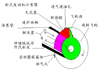 如圖所示:做功之初,提起活塞,首先將伸縮鐵板插進密封圓弧箱體內(nèi)用作汽缸底,飛輪齒用作汽缸頂,進油進氣后,推進活塞,壓迫油氣做功,飛輪旋轉(zhuǎn)帶動車體運動。最后排出廢氣復位,重復做功。