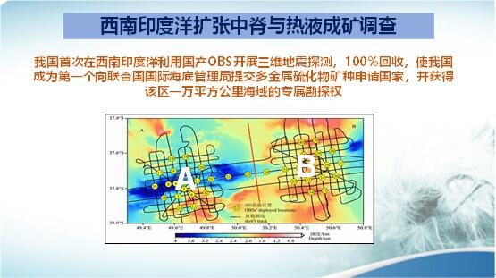 在全球的海洋中,大部分海洋為公海,有些國家已圈出自己具有礦產(chǎn)調查和開采權的某片海域。我們國家在西南印度洋布設了“中國結”的地震臺網(wǎng),開展三維地震觀測。并第一個向聯(lián)合國國際海洋海底管理局申請,獲得了這一地區(qū)一萬平方公里的多金屬硫化礦物的專屬開采權。