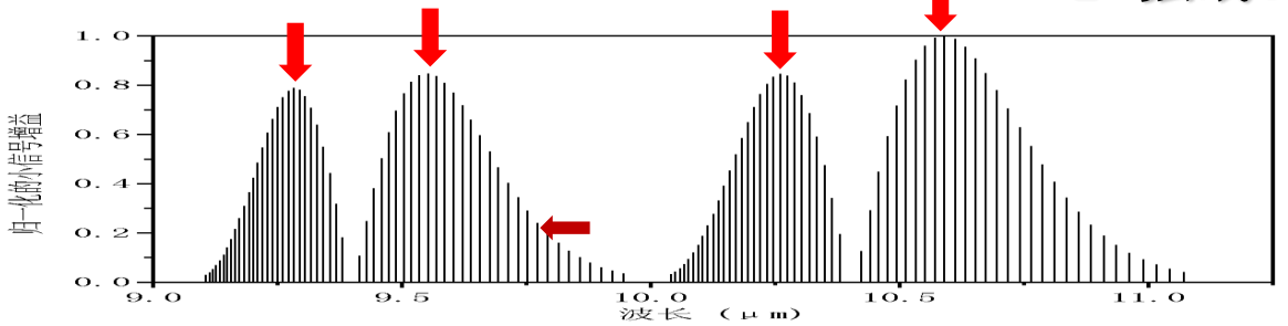 通常CO2激光器波長(zhǎng)是10.59mm,這只是CO2激光增益譜中最強(qiáng)的一條譜線。從圖2-3 CO2激光器的譜線圖中可以看出,實(shí)際上有四條譜線的增益都比較大,分別為10.59mm、10.25mm、9.55mm及9.27mm。以上四條譜線為各支的強(qiáng)線。但是在很多應(yīng)用需求中,除輸出這四條強(qiáng)線外還要求輸出某些增益很低的弱線,且實(shí)際應(yīng)用中還需要很高的光束質(zhì)量,因此有較大的研制難度。