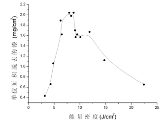 圖3-5 單位面積除漆質(zhì)量隨激光能量密度的變化曲線