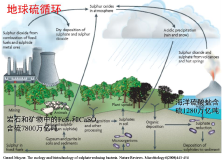 硫磺是重要化工原料,我國是硫磺消耗大國也是進口大國,2017年我國硫磺進口達1123.6萬噸,產(chǎn)量590萬噸。硫循環(huán)是地球三大物質(zhì)循環(huán)之一,硫各種價態(tài)間轉(zhuǎn)化的實現(xiàn)均由硫細菌來完成(圖1-1)。