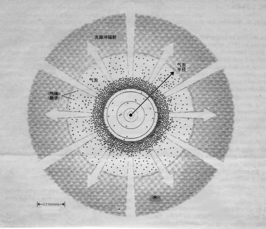 氣泡聲致發(fā)光如圖所示。氣泡外面是水。這個(gè)氣泡在超聲波的作用下,一會(huì)變大一會(huì)變小,氣泡里的小黑點(diǎn)代表氣體里的分子和原子。圖中標(biāo)尺的長度是0.2微米。氣泡在塌縮到一定程度時(shí)就發(fā)出光。