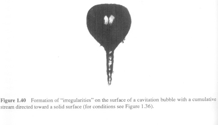 當(dāng)氣泡靠近容器壁時(shí),氣泡的形狀會(huì)持續(xù)變化,變到后來長出一個(gè)尾巴,像錐子一樣,錐子尖指向容器壁。這是氣泡典型的形狀,如圖3所示。通常人們會(huì)認(rèn)為氣泡是一個(gè)球,但現(xiàn)在看來并非如此。首先,這個(gè)錐形是非常尖的;第二,它是非常有力的,呈向外噴射狀。它碰到固體的邊時(shí),會(huì)打擊出一個(gè)小窟窿、一個(gè)麻點(diǎn),所以超聲波作用時(shí)間長了以后,固體的邊和拋光的面就會(huì)變毛。正因?yàn)檫@個(gè)力量是非常大的,作為超聲清洗的機(jī)理之一,即超聲波可以清洗骯臟的油、污漬等等。它的條件是一定要靠近固體邊,就是氣泡和固體邊相互作用。所以通過這兩張圖,我們能看出來,空化氣泡里面研究的學(xué)問是很深的。